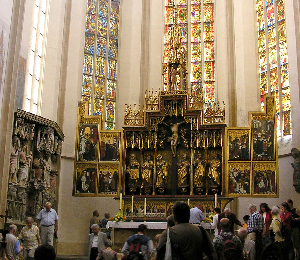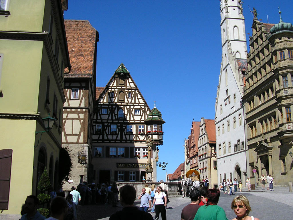 Unter anderem wurde die aus dem Jahre 1485 stammende St. Jakobskirche unter Leitung eines ortsansässigen Reiseführers besichtigt. Dort ist der weltberühmte Heiligblutaltar von Tilman Riemenschneider die wohl wichtigste Attraktion. Einem Teil der Gruppe gefiel Rothenburg sogar so sehr, dass sie sich vom Rest trennte und in der Stadt verblieb, während sich die anderen aufmachten, bergab ins Taubertal zu wandern, wo man auch die Mittagsverpflegung eingeplant hatte.